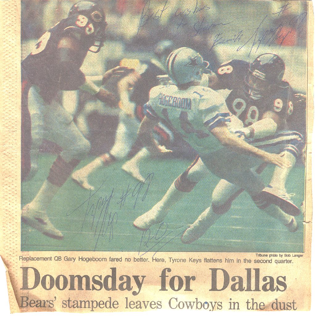 I don’t usually buy autographs on ebay but I couldn’t pass this one up…plus it was less than $7 including shipping. The woman I bought it from sells books on ebay and she found this in back of one of her books. This was taken from the Monday 11/18/85 Chicago Tribune when the Bears just shut out the Cowboys and were 12-0; I’m assuming it was signed sometime during that week. It’s a cool little piece of NFL history. I guess I don’t have a way to confirm it’s real but the signature matches up with some others I looked up online and it kind of fall into the “why would you go to the effort to fake this†category. I'm trying to get as many of the 85 Bears signatures as possible TTM but I just couldn't pass on this.