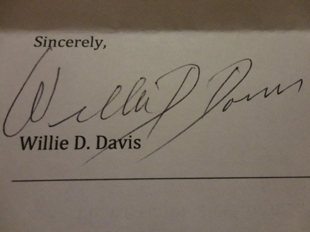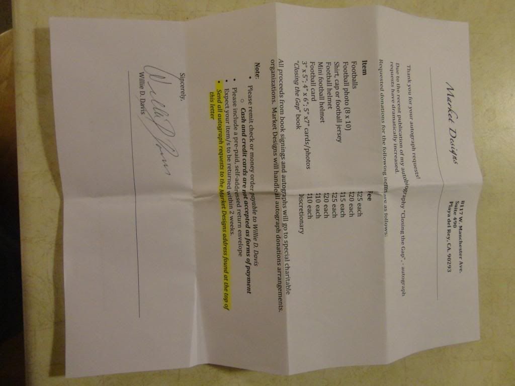 On 3/12/14 I sent a card to former Packers DE and HOF member Willie Davis. I didn't know to send a donation so I received back a price list and my card back unsigned today. Although I'm hesitant to call this a "success" it appears that he signed the price list though. I don't think it's a preprint due to the ink bubbles on the "D"s. Also, the ink tends to trail off on the ends of the letters. The signature also matches very closely to other signatures of his that I looked up. The only difference is that it appears he generally doesn't sign his middle initial. Any thoughts? Either way I think I'm going to resend with the donation.