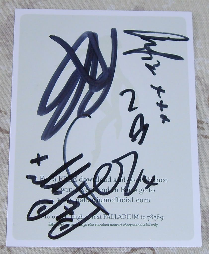 A friend and I went to see Mika at Doncaster Dome on Saturday 24th Nov and after the gig the support act, Palladium, were all out collecting peoples email addresses for their mailing list. We had our photos took with them and they all signed the promo cards they were giving out.