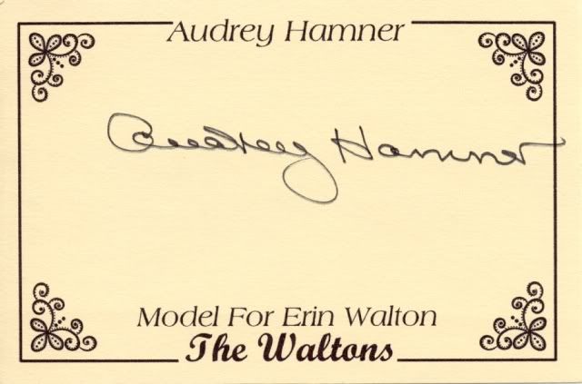 Big ‘Thank you’ goes out to my friend Bruce for helping me add my 8th Earl Hamner and my first Audrey Hamner autograph to my Waltons Cast & Crew project!! Bruce met both of them at the annual Waltons reunion in Charlottesville, VA on Saturday November 7th 2009 and both were more than happy to sign my custom items. Very happy as I’ve wanted to add Earl on one of my custom 4x6 photos that features his one and only cameo in ‘The Waltons’ as Michael McKenzie from ‘The Journey’ episode on season 2 for a long time. Thanks Bruce!