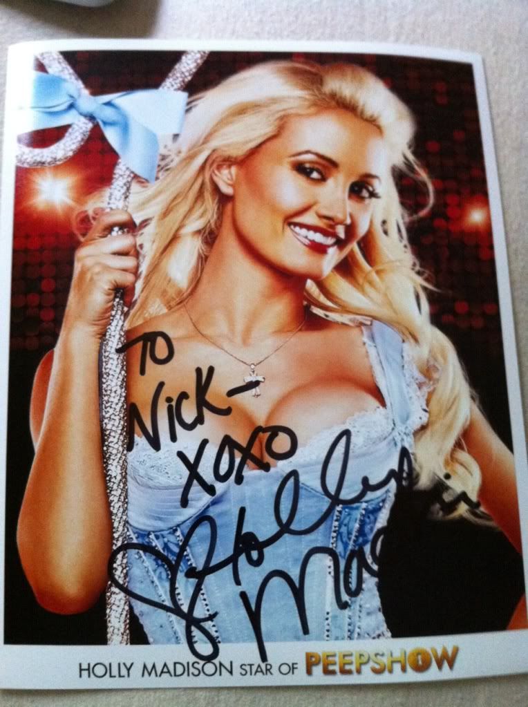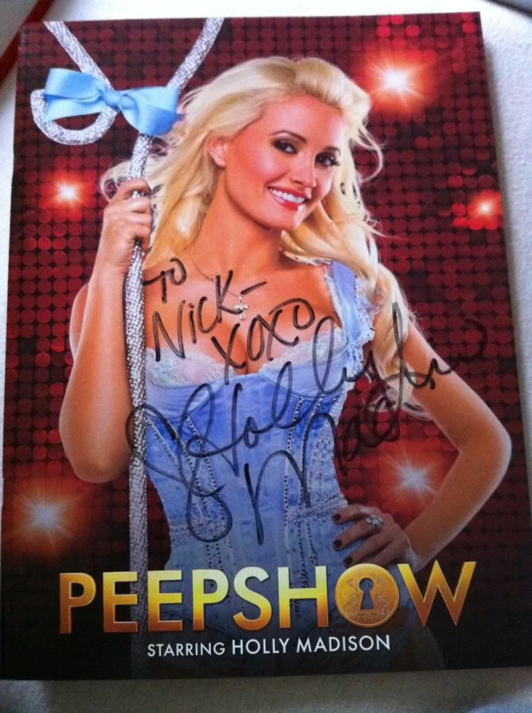10/17 I had the pleasure of meeting Holly at Peepshow in Las Vegas. I got VIP tickets. I had her sign the photo I sent to the Playboy Mansion for Hugh Hefner to sign as well as a program from the show and a photo she provided.