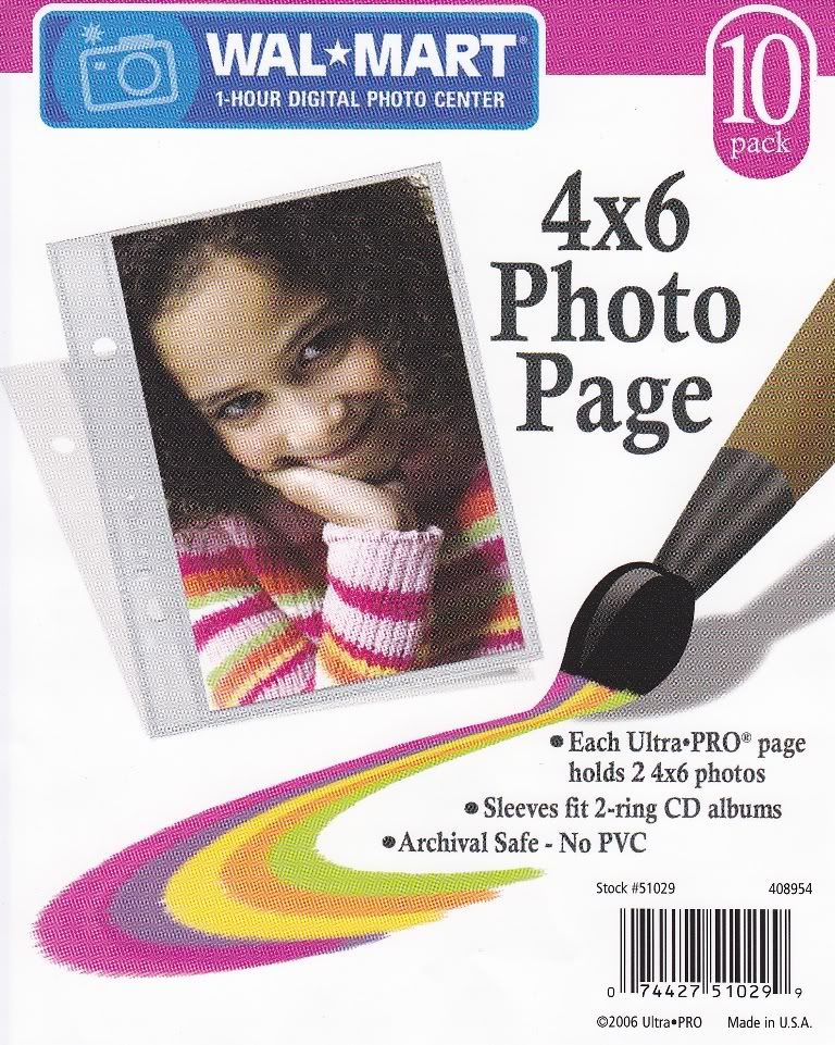 4x6 Ultra-PRO single page holder (Wal-Mart photo lab Exclusive)(10 pages for .99)http://i81.photobucket.com/albums/j201/ ... ra-pro.jpg