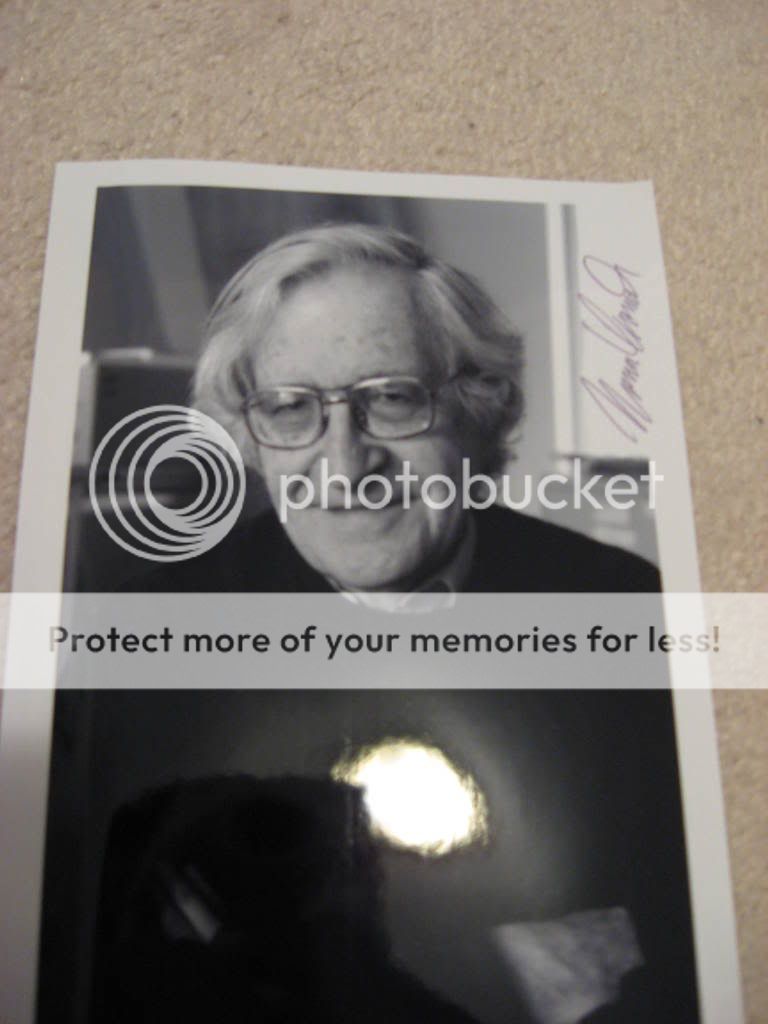 I sent Professor Chomsky an email through his website, requesting an autograph. He replied "I'd be glad to arrange it".