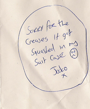 Ahhh! So happy about this, I LOVE Lostprophets. Sent on the 16th of August to one of their shows at the O2 Hammersmith, London. (Address no longer valid!) The photo got pretty squished as it was in Jocko's suitcase, but he wrote me a sweet little note on the envelope to apologise: http://i219.photobucket.com/albums/cc17 ... onote1.png (To be honest, I don't mind too much. I think it's cool that it was actually in his suitcase, haha!)