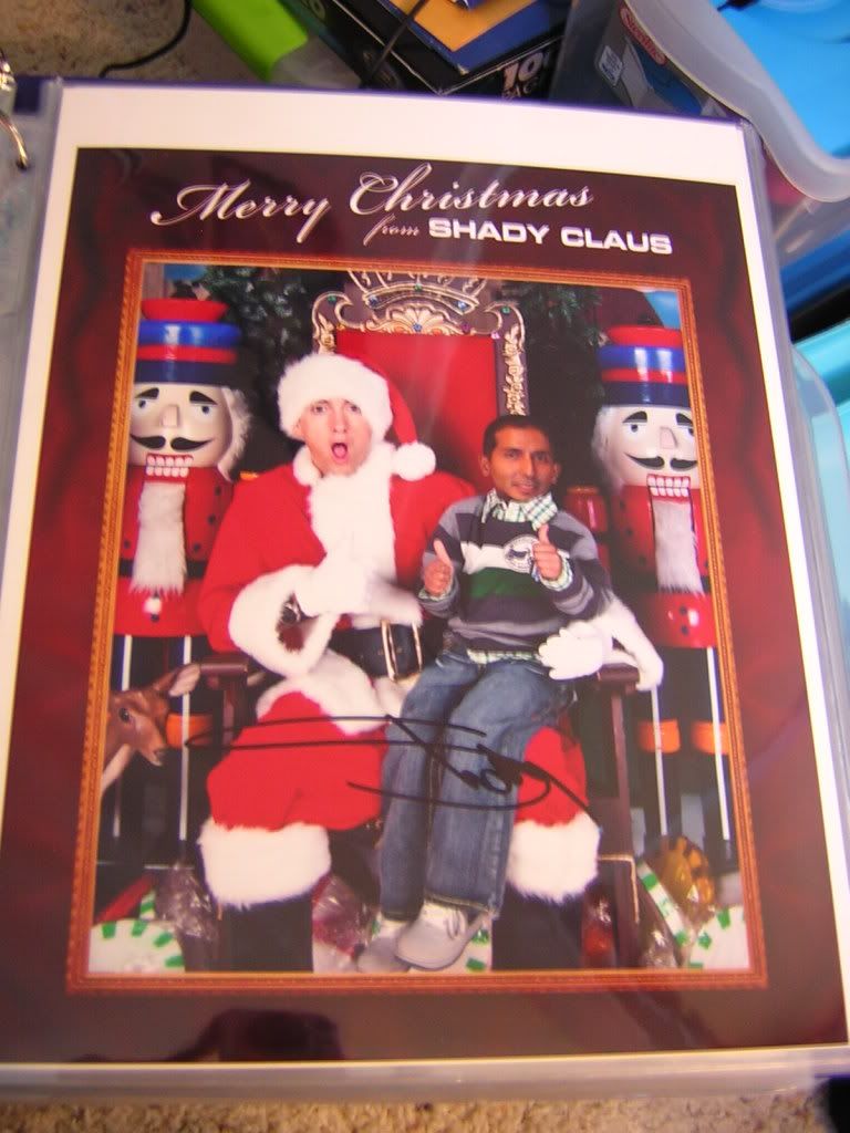 Hi all! I just received this cool signed 8X10 from Eminem (AKA Shady Claus, lol). It was only 25 dollars which all went to his charity. Bought directly from his website so this is the real deal! The photoshopping of your face isn't all that bad if you don't plan on selling the pic. Great deal wouldn't you say!!!